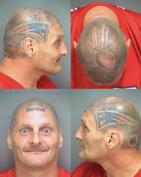 As noted in the “Scars, Marks, Tattoos or other distinguishing features” section of his police report, Thompson has “Tattoo Head-Patriots Football Helmet.” The helmet included a series of tattoos inked on Thompson’s head to make it appear that he is wearing a New England Patriots football helmet. Along with team logos on each side of his head, Thompson got Brady’s number 12 and the word “Patriots” inked on the back of his head. He added the name of the helmet maker (“Riddell”) on his forehead, as well as an American flag and an NFL logo. Incredibly, Thompson even included the small green dot indicating that a helmet is equipped with an electronic device allowing its wearer to receive plays from the sideline. If that’s not enough for you, Thompson also had a likeness of the Super Bowl trophy tattooed on the top of his head. Additionally, his noggin features inked replicas of the signatures of players Rob Gronkowski, Wes Welker, and Randy Moss. Somehow, Thompson forgot to add Aaron Hernandez’s John Hancock to his cranium. Jailers took four separate booking photos of Thompson so that his tattoos could be memorialized for possible future identification purposes.