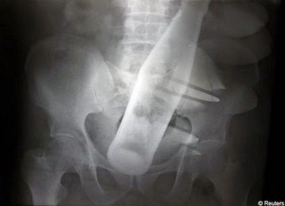 Also prompting to fess up was Ms. Searcy, who admitted to stashing her hidden meth pipe as indicated below… (okay, so that’s a bottle and not a pipe in the X-Ray below, sue me… I couldn’t find an image with a pipe of any sort, although I did find a gun – in fact I blogged about that last week – a pair of scissors and a variety of other useful items…. Use your imagination and I’m sure that you’ll get the idea).