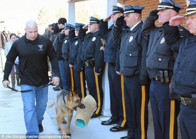 Judge made his way though an impressive honor guard, clutching his trusted training sleeve in his once powerful jaws, as he walked into the Swedesboro Animal Hospital / St. Francis Veternary Clinic for his final visit.