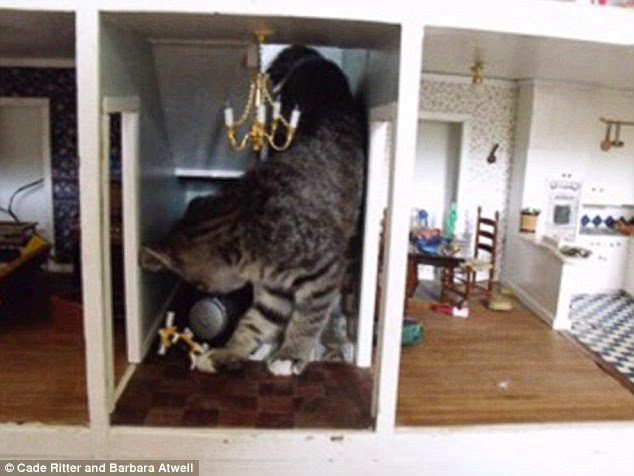 While the monster above presents as a giant cat coming down the stairs of a house, teeth bared and biting for the chandelier, it is in fact a kitten which some social media users took to calling “Catzilla”, “Kat Kong” and “Fluffy Destroyer of Worlds”. But other of Cade’s photos prove that, disappointingly, the photo actually shows a normal sized kitten playfully exploring the inside of a meticulously detailed dollhouse.