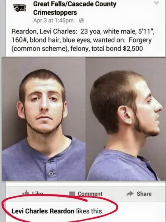 Anyhow, jumping ahead a few thousand years, in January, 2015 Chuckie became the prime suspect in a theft case involving a wallet and a stolen check book, several of which were made payable to Chuckie and at least one of which (a check) Chuckie had cashed at a grocery store. When cops couldn’t locate him they put out an APB, among other places on the local Crime Stoppers Facebook Page (found here). One of Chuckie’s buddies saw the post and tagged his friend (Chuckie), who then himself “Liked” the wanted post.