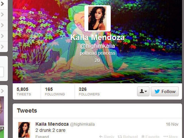 Kayla tried to explain the “2 drunk 2 care” Tweet away during a pre-sentencing interview with Inside Edition (which you can see here) by stating that the Tweet was meant for her then boyfriend, with whom she had had a falling out. In the interview Kayla said: “It did not mean ‘I’m too drunk to care, I’m going to get in my car now and wherever the hell I end up, that’s it’, No. It was directed to my boyfriend. That’s the only person that it was for.” However, and unfortunately Kayla, her Twitter history compounded her problems, exponentially. For instance, Kayla had nicknamed herself the “Pothead Princess” and had chosen the moniker “@highimkalia“…
