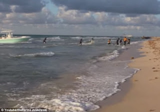 The pictures were generated from video which was taken by photographer Ekaterina Juskowski while her unnamed model friend strolled down the beach in a sequined dress at about 6:00 am on July 10th, 2015. When Ekaterina saw the boat approaching the shore she initially thought that it contained a group of scuba divers, so she stopped shooting the video (which you can see in it’s entirety here). However, as soon as she realized that it was nine (9) illegal immigrants bailing out of the vessel (which was itself abandoned) and running toward the sand she turned her camera back on.