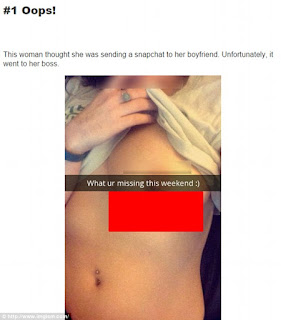 Below is a partially nude late night Snapchat selfie which was allegedly intended by an unnamed woman to be sent to her boyfriend but which instead was delivered to her boss. (In case you can’t see it too well the woman can be seen seductively lifting her shirt to reveal a breast and her stomach and the image is accompanied with the caption: “What ur missing this weekend :)”.