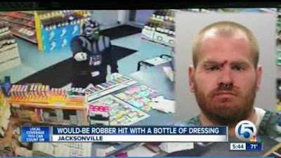 After being hit in the face with the bottle of salad dressing, and in a very un-Darth Vader like move, Jacob turned tail and ran away. He was identified by a witness who saw him take off the mask, enter a vehicle and drive away. Cops located Darth Jacob – who turns out to have been a convicted felon – a few blocks away, bleeding from the bridge of his nose (where the bottle of salad dressing landed) and in possession of a backpack which contained “several handguns and ammunition”. Jacob was charged with armed robbery and possession of a firearm by a convicted felon and now faces life in prison.