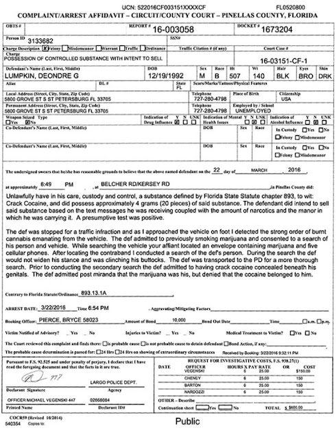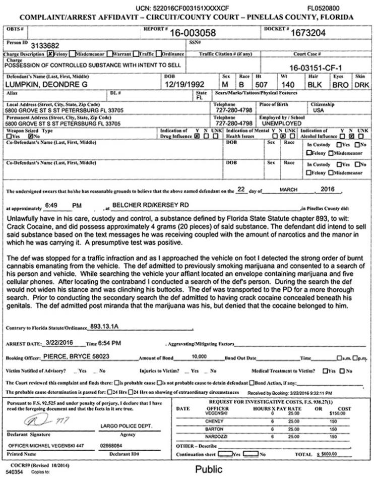 Per a Largo Police Department police report (a copy of which you can see below) Deon had been stopped for a routine traffic infraction. When the officer approached he smelled marijuana (giving the LEO “PC” – probable cause – to transform the temporary detention info a criminal investigation) and, upon inquiry, Deon reportedly consented to a warrantless search.