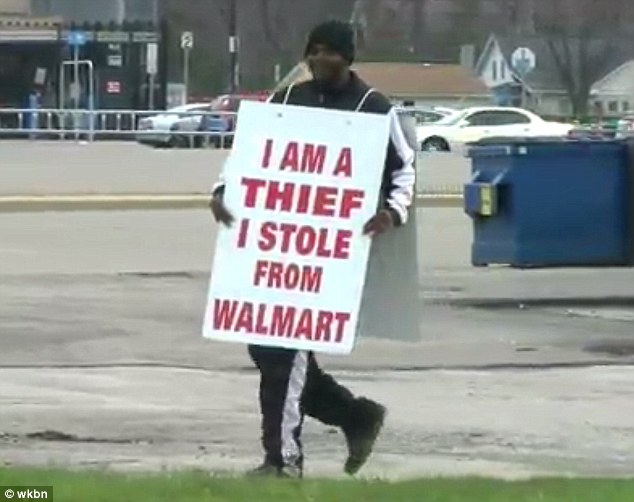 A Girard Municipal Court judge found Greg guilty of theft and then gave him a choice during sentencing: Greg was given the option of serving 30 days in jail or wearing a sign saying “I am a Thief I stole from WalMart” in front of the store for eight (8) hours a day for ten (10) days. Greg made the right decision; he chose the sign.