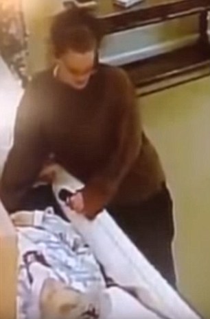 In the surveillance video (which you can see by clicking hereHomfeld is clearly seen walking straight over the casket and then leaning into the body. She also appears to be talking to the corpse.