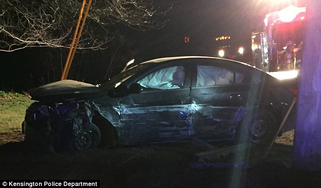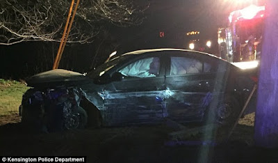 More specifically, after crossing into the wrong lane of traffic, Joshua drove straight through a stone wall, and then a granite post, and continued on until he hit a utility pole and got caught up in its guide wires.  That is his car below, mangled, with huge dents and scrapes in the left-hand doors, a twisted hood and destroyed front-left wheel arch.