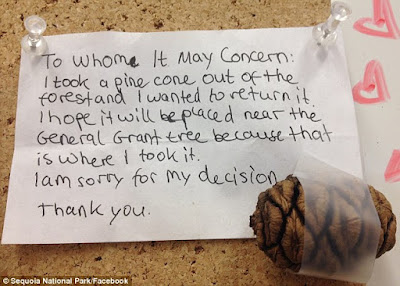 A seemingly young and guilt-ridden pine cone thief decided to return his booty to its original owner – the Sequoia and Kings Canyon National Parks – with the following and heartwarming apology letter: “To whom it may concern,’ read the handwritten note. ‘I took a pine cone out of the forest and I wanted to return it. I hope it will be replaced near the General Grant tree because that is where I took it. I am sorry for my decision. Thank you.”