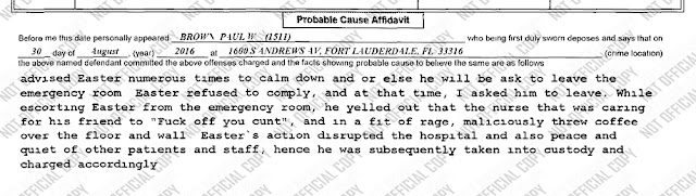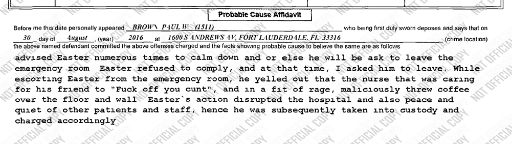 While he was visiting a friend who was reportedly being treated in the emergency room at a local hospital. According to the arrest report (a part of which you can read below) while in the ER Charles became unruly during the visit, which prompted staff to call the police. As he was being escorted out of the hospital by a police officer Charles reportedly yelled at a nurse, “F*** off you c**t”, and then “in a fit of rage”, he allegedly “maliciously threw coffee over the floor and wall.”