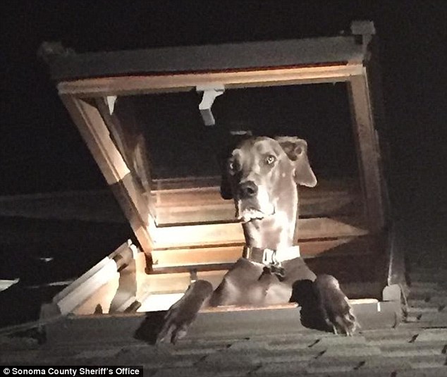 Sonoma County Sheriff’s Deputies arrived, rescued the man and his other pets and then began an investigation of the scene which promptly resulted in a Deputy hearing a scratching noise outside of the home. Per a police spokesman: “He shined his light around the house and saw this dog sticking his head out a skylight on the roof. The deputy said — and I quote — “At that point we ditched all tactics and died laughing”.”
