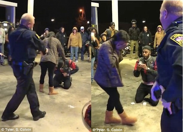 Daiwon and Shawna were riding tandem with a group of friends, all on motorcycles, and after they pulled into a gas station police appeared, pulled out unloaded stun guns and demanded that Daiwon get on the ground. As Daiwon followed orders a terrified Shawna tried to diffuse the situation, and when the officers demand that he gives up his gun, instead of a weapon Daiwon pulled out an engagement ring.