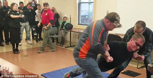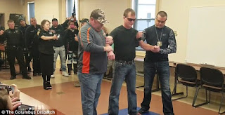 The first of six (6) officers to volunteer was Sgt. Doug Bline, who is pictured below being flanked by two (2) fellow officers.