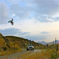 The Instagram video shows a motorcycle traveling along a dirt path up a hillside near State Route 60 (which lies in a hilly landscape in Southern California), then ascending a hill with greenery on the right and barren mountains on the left, then arriving at the jump-off point and finally jumping from hill to hill over moving cars below.