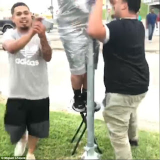 A video of the payback was immediately posted (you can watch the video by clicking here) and in it one of the pranksters can be heard yelling: “We’re going to tape this boy up!” as he claps two rolls of duct tape together. The video continues with Miguel standing on a stool next to the pole as his gleeful friends circle him, wrapping him in tape.