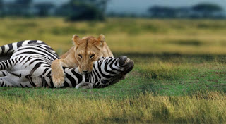 No that’s not our / the zebra, that’s another escaped zebra that cops corralled nearly 2 years ago to the day in Altoona, Iowa (click here to read that story). Fortunately in this case, unlike the shocked and awed driver, our / the zebra was not injured by it’s (literal) run in with a moving car and it was eventually returned to it’s home, a farm near Wimauma, and so there’s a happy non-road kill ending for our / the zebra, unlike this one, on the Serengeti…