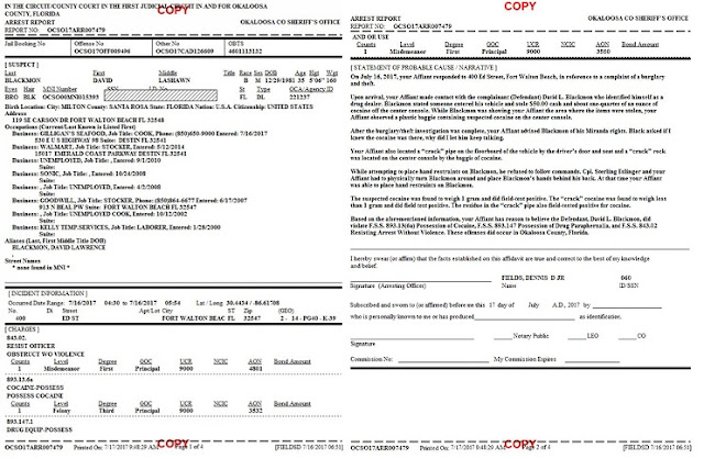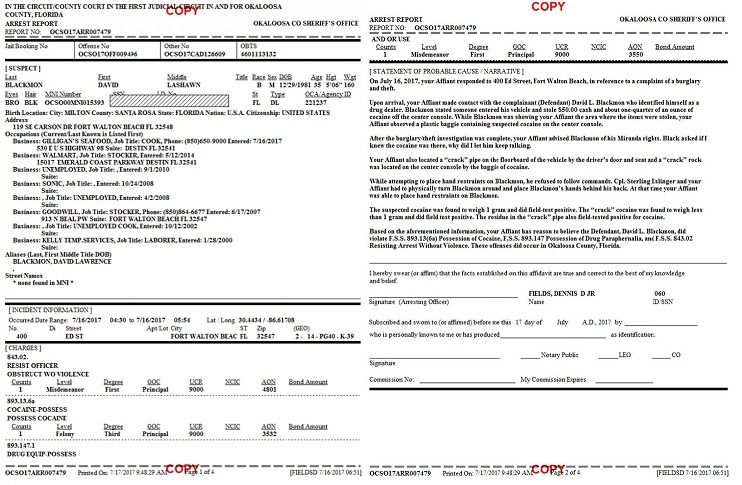 According to a police report (which you can see below), on Sunday, July 16, 2017 David dialed 911 complaining about a burglary and theft. When an Okaloosa County Deputy Sheriff responded David reportedly identified himself as a “drug dealer”, telling police that “someone entered his vehicle and stole $50.00 cash and about one-quarter of an ounce of cocaine off the center console.”