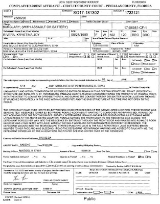 According to a Pinellas County Sheriff’s Department police report (image below) on June 6th, 2017 Krystina sent a series of text messages to her ex-boyfriend Ronald Koch seeking a booty call. Ron, who is apparently well over and done with Krystina (apparently with good cause), is involved with another woman (who is hopefully not as nuts), Julie Thomas.